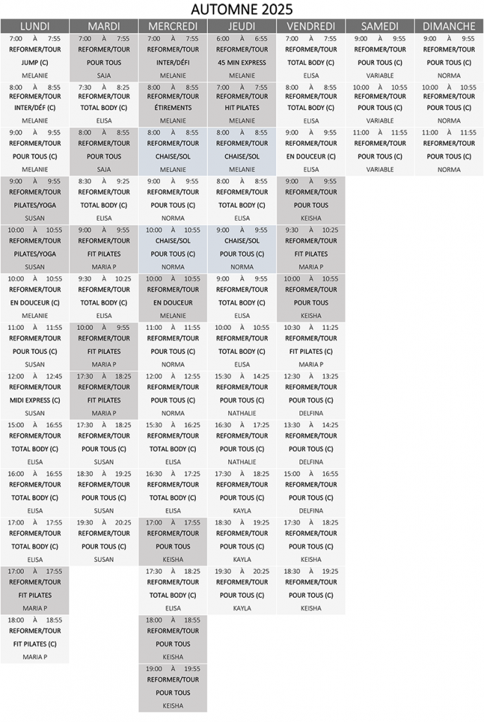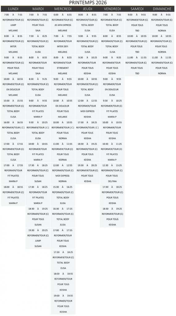 ** Nous demandons aux participants des cours pilates d’arriver AVANT le début de l’heure des cours. Places limitées
