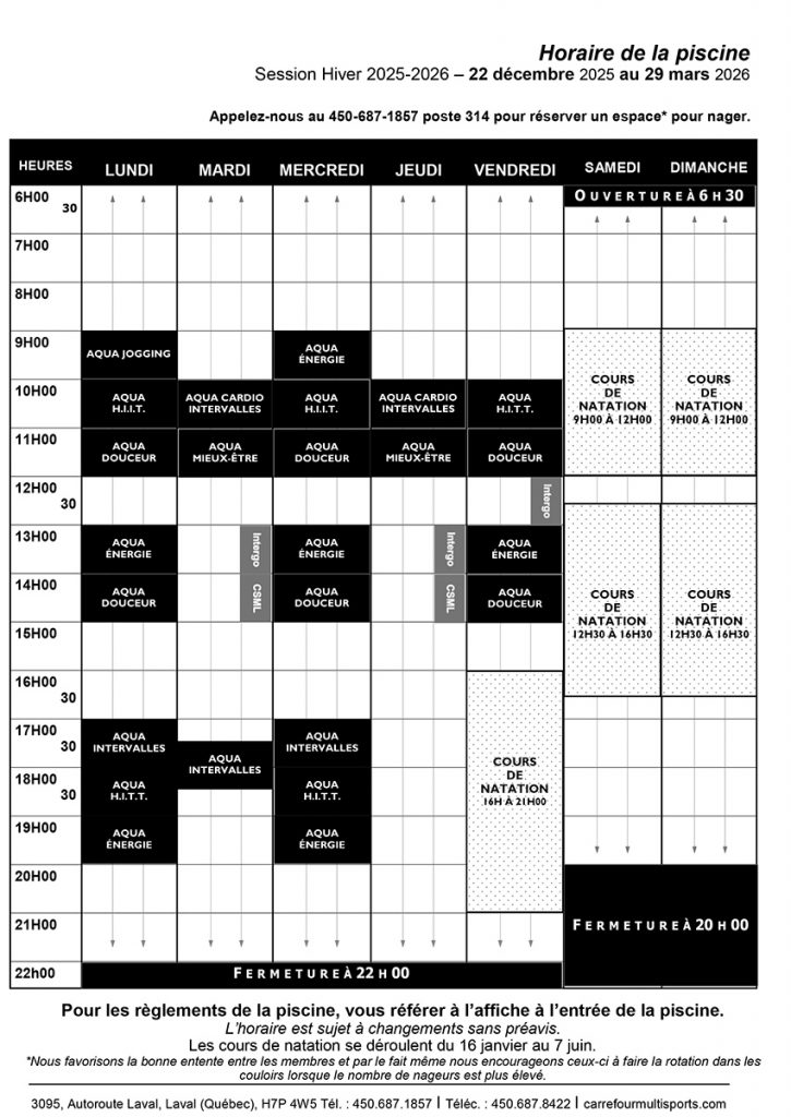 Appelez-nous au 450-687-1857 poste 314 pour réserver un corridor de nage.
