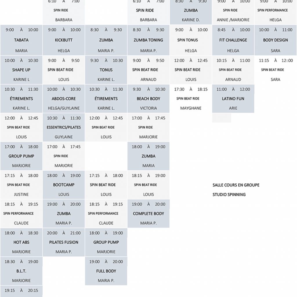 Vous pouvez réserver directement votre place via notre nouvelle plateforme en ligne, 48 heures à l’avance, ou faites-le par téléphone au (450) 687-1857 poste 314. Trouvez le cours qui vous convient ou consultez l’horaire complet de la semaine.